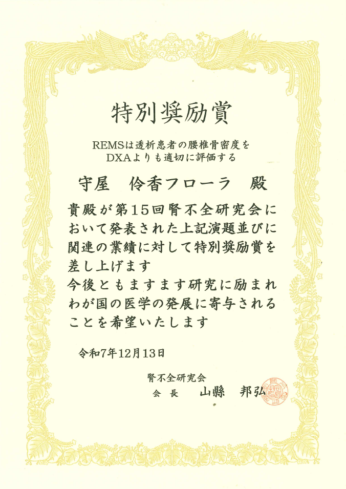 このたび、12月13日に開催された第15回腎不全研究会において、本医局員が特別奨励賞を受賞しました。